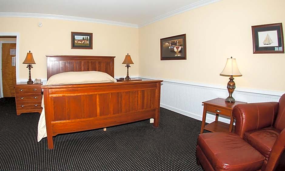 This room features a balcony with views of the river, an electric fireplace, flat-screen TV, and a bathroom with granite counters.